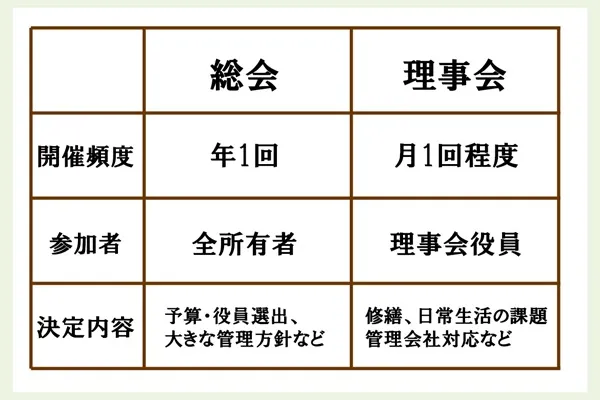 A. 総会は年に1回、住民全員が参加して予算や役員選出などの重要事項を決める場です。理事会は月1回程度開催され、選ばれた役員が日常の運営を話し合います。